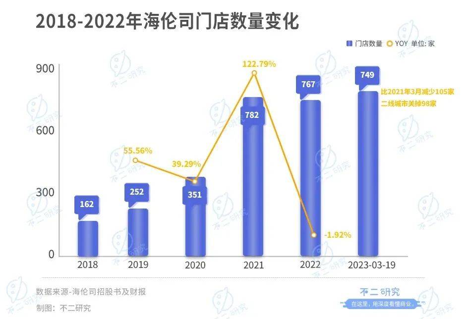2018-2022年,海伦司的酒馆总数分别为162家、252家、351家、782家,767家,门店数量的复合年增长率为47.2%。截至2023年3月19日,海伦司门店数量达到749家,比2021年3月减少105家,其中二线城市关掉98家。