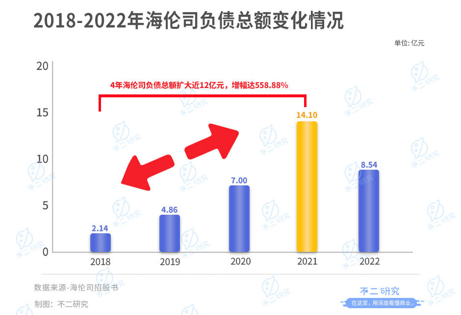与此同时,从2018年-2021年海伦司的负债总额从2.14亿元升至14.10亿元。 与2018年相比,4年间,海伦司负债总额扩大近12亿元,增幅达558.88%。