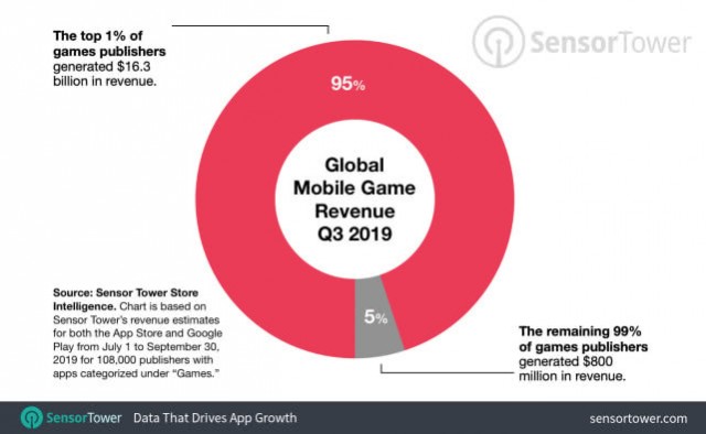 在游戏收入方面,我们看到的差距最大。在2019年第三季度,苹果和谷歌应用商店中的全球游戏带来了163亿美元收入,其中收入最高的1%(445家)发行商持有155亿美元,占总收入的95%,剩下的8亿美元由其余99%(44029家)发行商瓜分,平均每家收入略高于18100美元。