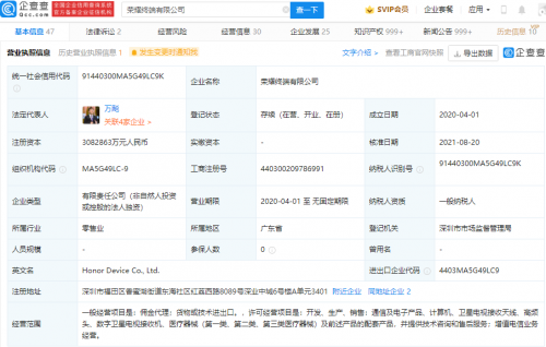 荣耀终端有限公司注册资本增加至308.29亿,增幅160.06%快报