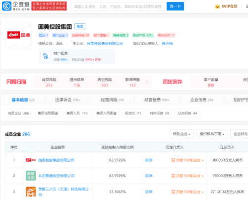 企查查APP显示,国美控股集团有限公司成立于2001年5月,由北京鹏润投资有限公司全资持股,后者大股东为黄俊烈(黄光裕),持股约82.59%。公司所处集团国美控股集团,当前成员企业近300家。