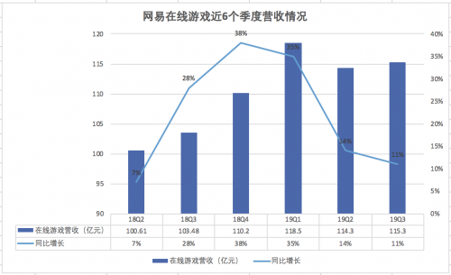 作为网易最赚钱的一块业务,在线游戏第三季度录得净收入为115.35亿元,占总营收的比重为78.8%。相较于上一季度和去年同期的114.33亿元和103.48亿元净收入,环比增长0.9%,同比增长11.5%,增速放缓。