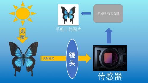 第二步,光在蝴蝶身上发生反射,反射的光透过镜头照入传感器。