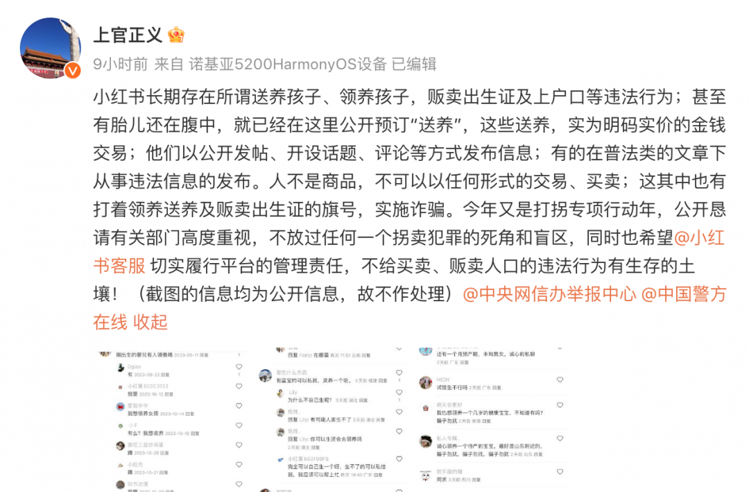 【TechWeb】5月21日消息,今日,博主@上官正义在微博爆料称,小红书长期存在所谓送养孩子、领养孩子,贩卖出生证及上户口等违法行为,引发广泛关注。