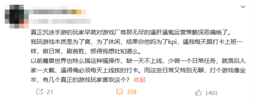 “我玩游戏本质是为了爽,为了休闲,结果你他妈为了kpi,逼我每天跟打卡上班一样,做日常,刷首胜,烦得我想吐知道么。”