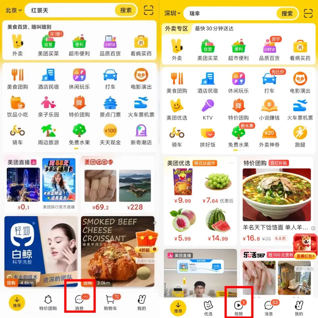 不信你现在打开美团APP,在主页下方的C位,就能看到“视频”明晃晃两个字,而在此之前,这个位置还是“消息”。