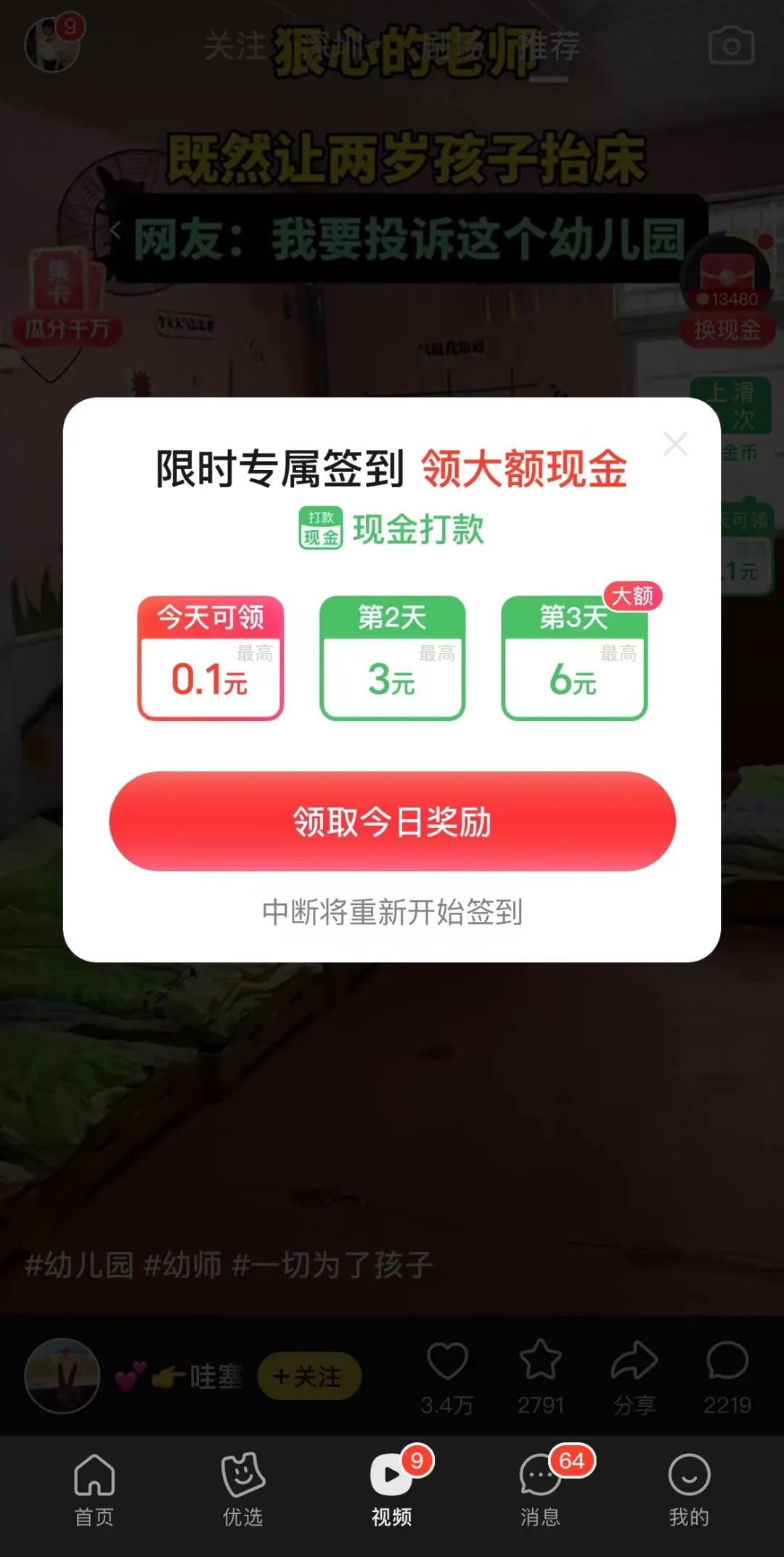 当然,美团应该也是意识到自己的弱项,所以它现在采用了最粗暴简单的“网赚”模式去吸引用户,无论是在“剧场”频道,还是“推荐”频道,用户只要浏览到一定的时间,都可以获得奖励。