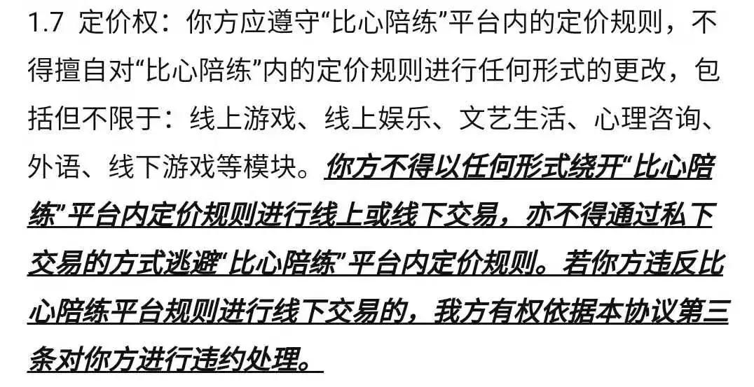 比心目前的解决方法是在《比心大神协议》中定价权一项,对线下交易行为进行约束,不过这一条款有多少约束力,尚未可知,私自交易现象确实存在。