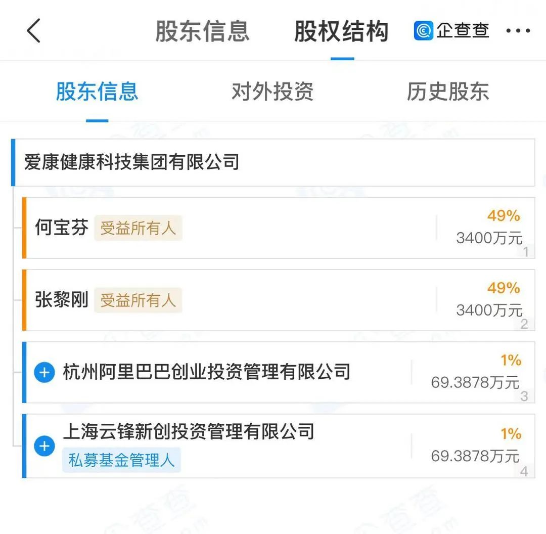 企查查的信息显示,从该公司目前的股权结构来看,张黎刚、何宝芬各自持股49%;杭州阿里巴巴创业投资管理有限公司、上海云锋新创投资管理有限公司分别持股1%。