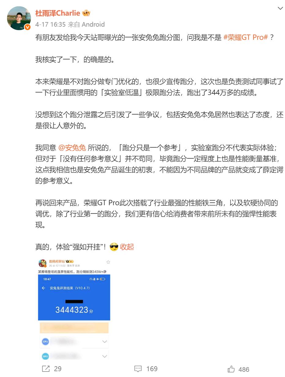 针对安兔兔的质疑,荣耀GT系列产品经理杜雨泽直接认领了产品,他表示,有朋友发给我今天站哥曝光的一张安兔兔跑分图,问我是不是荣耀GT Pro ?核实了一下的确是的。