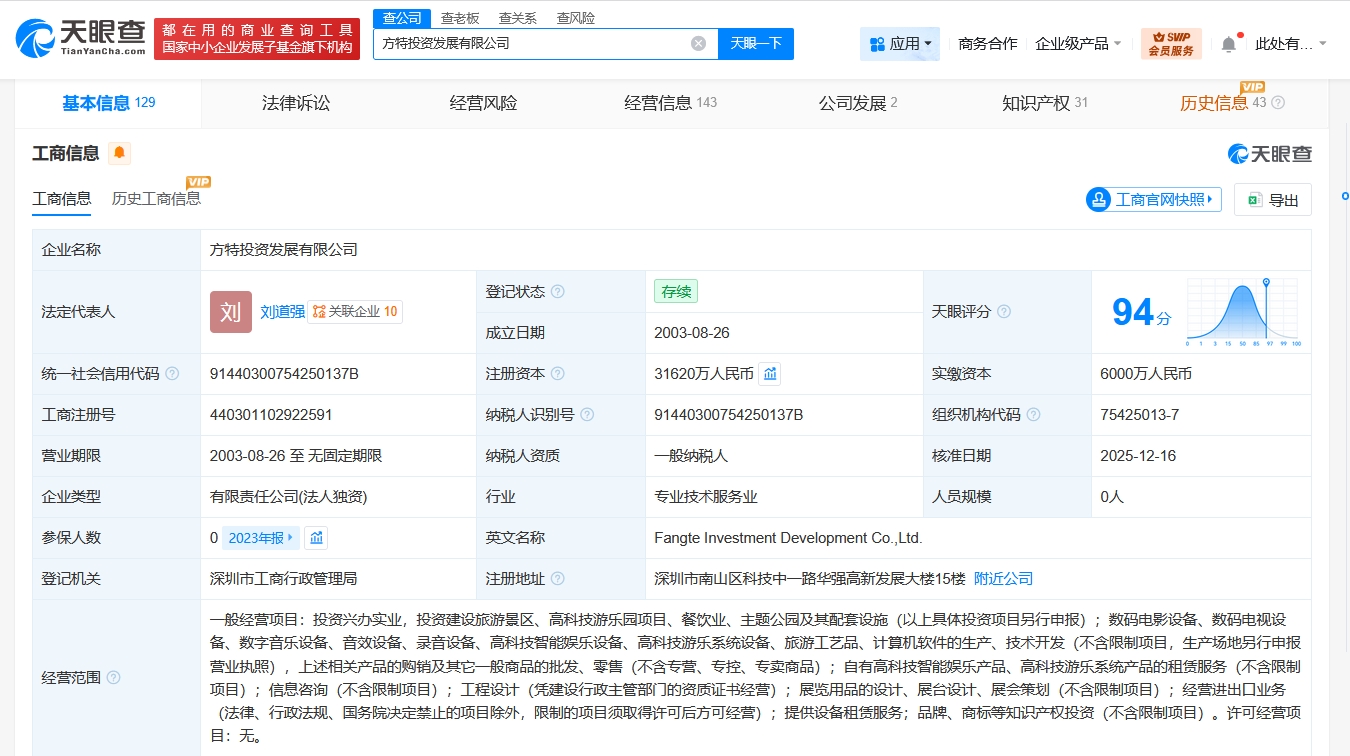 天眼查App显示,近日,方特投资发展有限公司发生工商变更,注册资本由6000万人民币增至约3.2亿人民币,增幅427%。