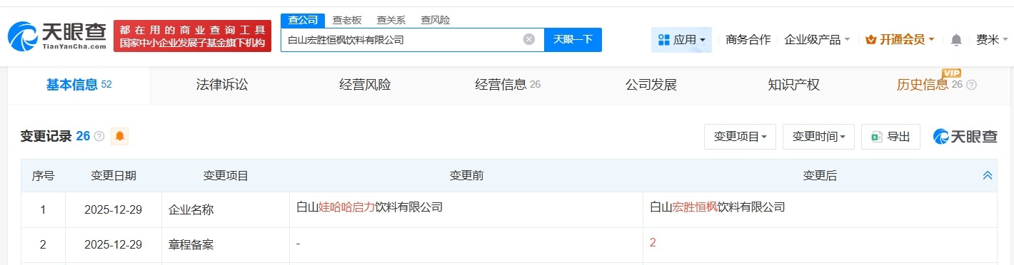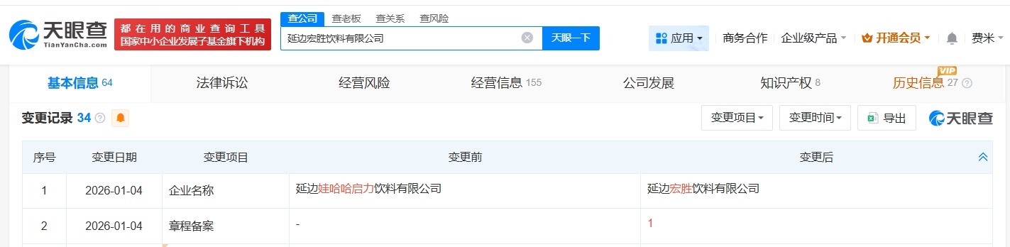天眼查工商信息显示,近日,延边娃哈哈启力饮料有限公司发生工商变更,企业名称变更为延边宏胜饮料有限公司。