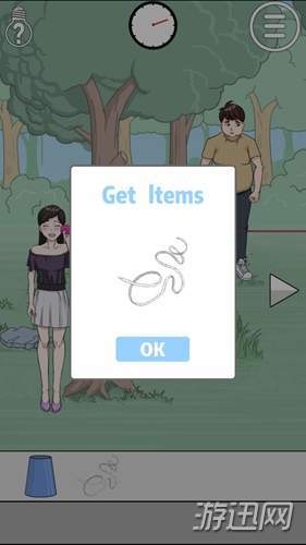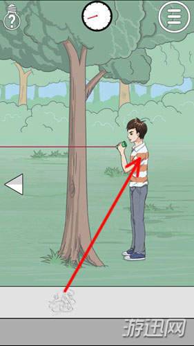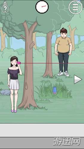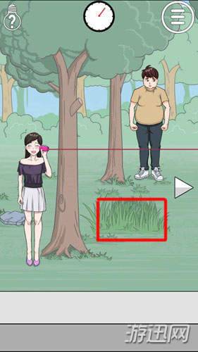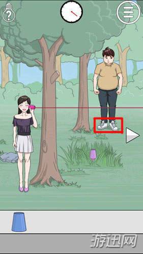 点击胖子的鞋带,点击草丛里的杯子,按住鞋带拖到男主角身上。