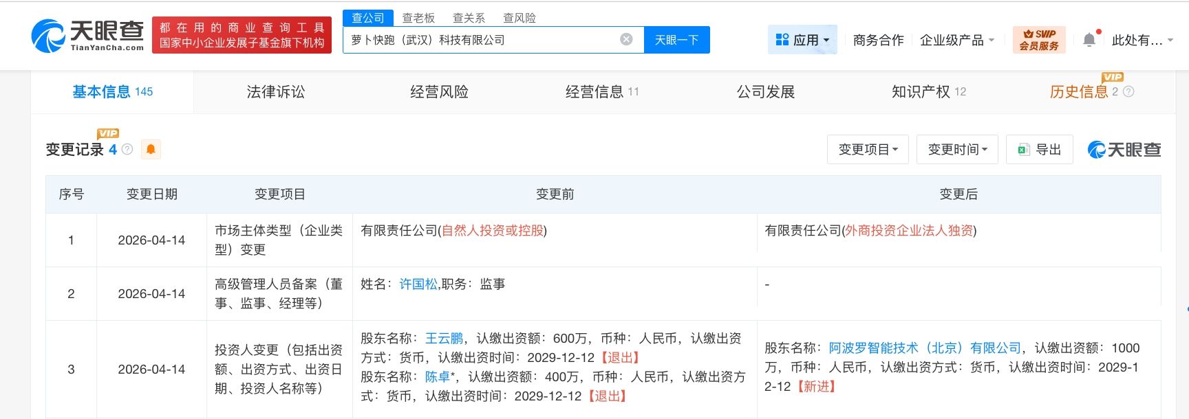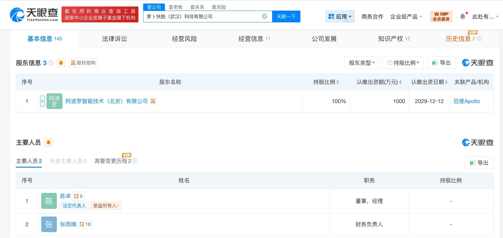天眼查App显示,近日,萝卜快跑(武汉)科技有限公司发生工商变更,王云鹏、陈卓退出股东行列,新增百度旗下阿波罗智能技术(北京)有限公司为股东并全资持股,同时,部分高管发生变更。
