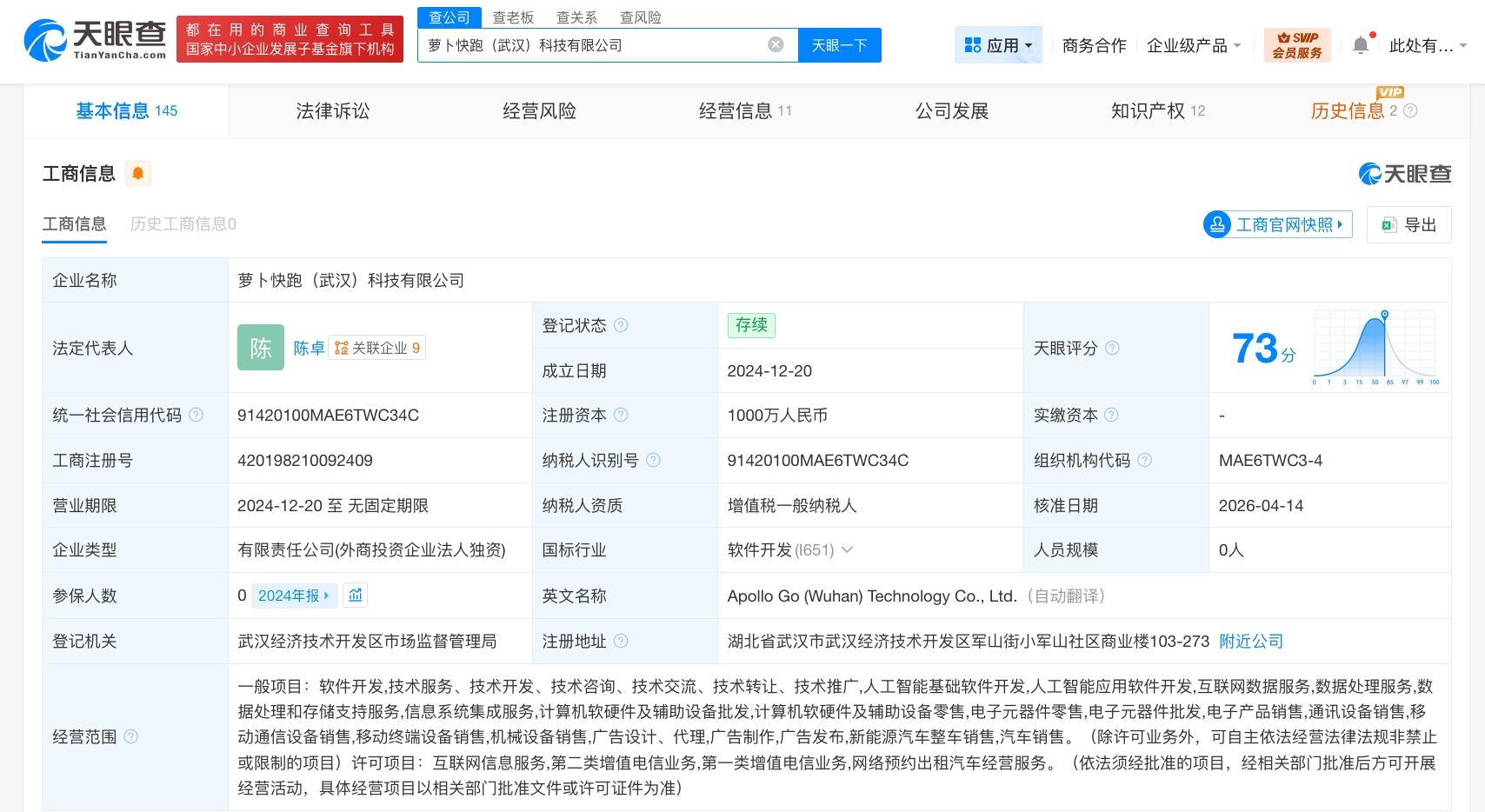 萝卜快跑(武汉)科技有限公司成立于2024年12月,法定代表人为陈卓,注册资本1000万人民币,经营范围含人工智能基础软件开发、人工智能应用软件开发、互联网数据服务、数据处理服务、数据处理和存储支持服务、信息系统集成服务等。