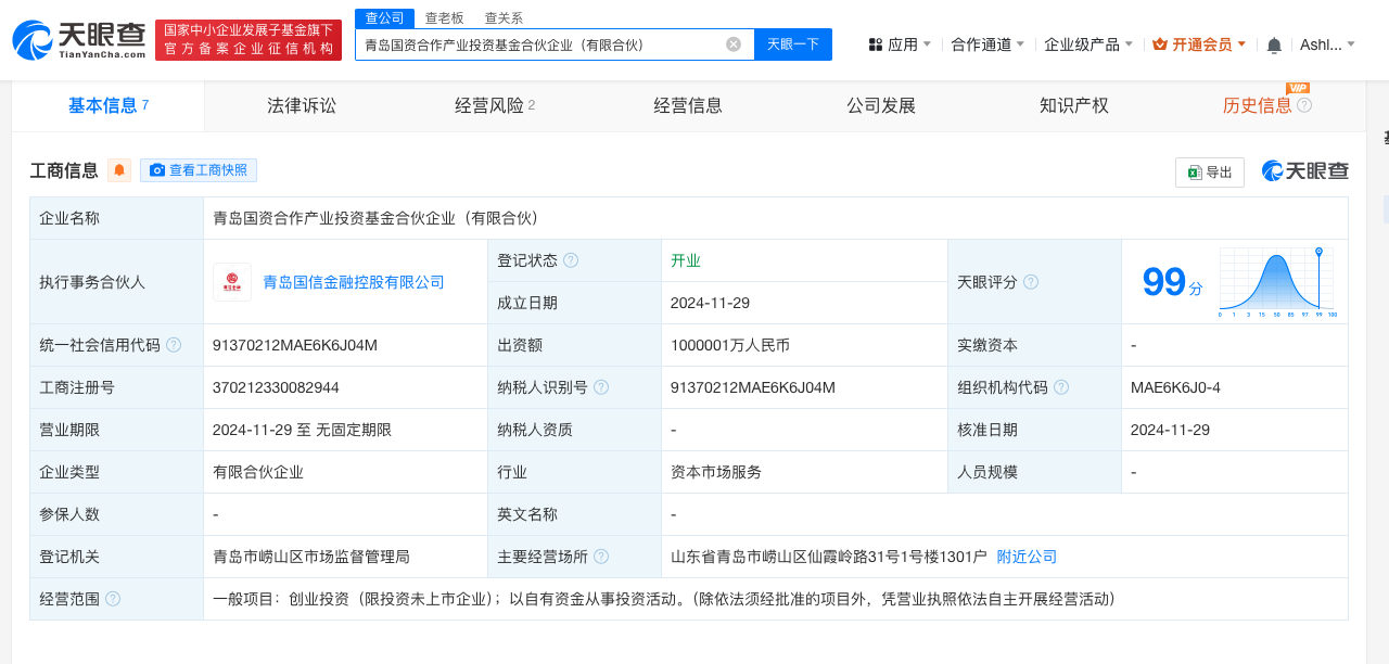 天眼查App显示,近日,青岛国资合作产业投资基金合伙企业(有限合伙)成立,执行事务合伙人为青岛国信金融控股有限公司,出资额约100亿人民币,经营范围为创业投资、以自有资金从事投资活动。合伙人信息显示,该基金由青岛财通资产管理有限责任公司、青岛国信发展(集团)有限责任公司、青岛城投地产投资控股(集团)有限公司等共同出资。