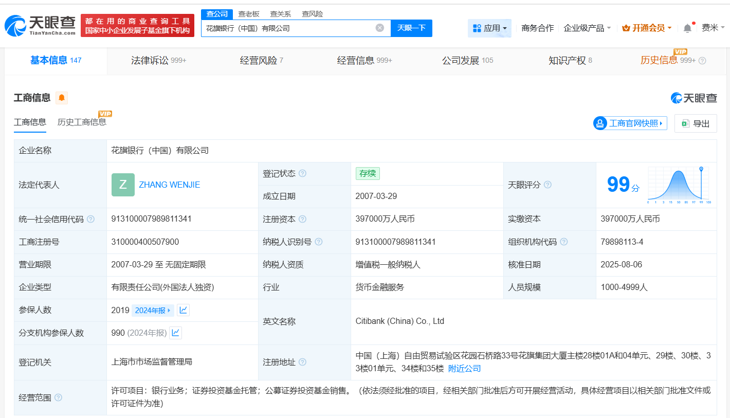 天眼查工商信息显示,花旗中国关联公司花旗银行(中国)有限公司成立于2007年3月,注册资本39.7亿人民币,经营范围为银行业务、证券投资基金托管、公募证券投资基金销售。股东信息显示,该公司由美国花旗银行有限公司全资持股。分支机构信息显示,该公司的56家分支机构中,仅14家处于存续或开业状态,其余42家分支机构已被注销或吊销。变更记录信息显示,今年8月,卢伟明(LO, WAI MING STEVEN)卸任董事长,由SAN AVELINE PAU LEN接任;今年7月,杨长浩卸任法定代表人,由ZHANG WENJIE接任。