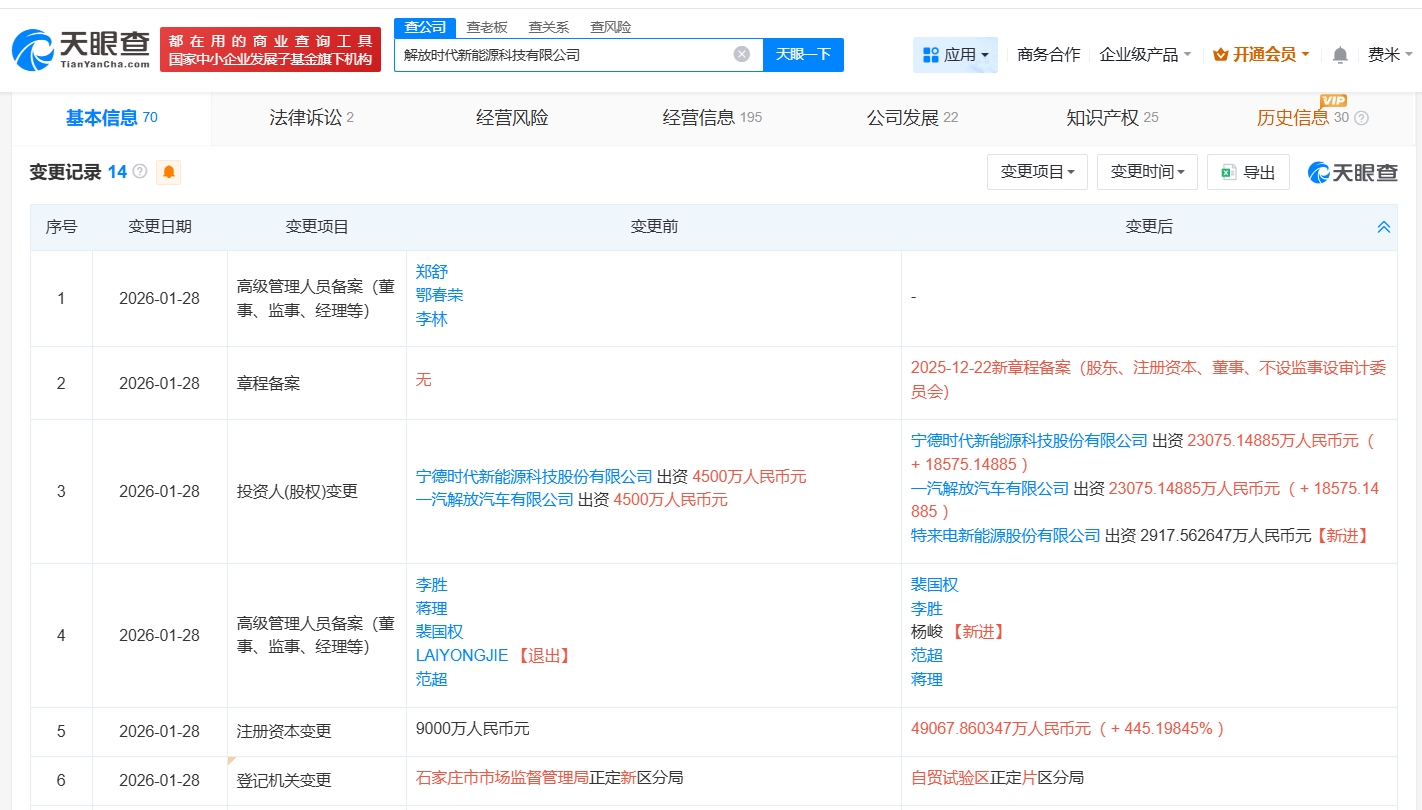 天眼查App显示,近日,解放时代新能源科技有限公司发生工商变更,新增特来电新能源股份有限公司为股东,同时,注册资本由9000万人民币增至约4.9亿人民币。