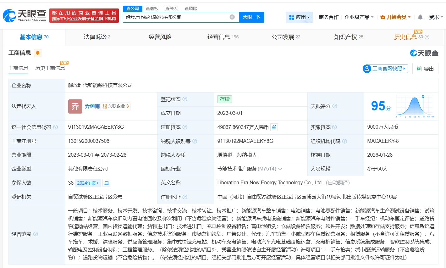 该公司成立于2023年3月,法定代表人为乔燕南,经营范围包括新能源汽车整车销售、电池销售、电池零配件销售等,现由一汽解放汽车有限公司、宁德时代(300750)及上述新增股东共同持股。