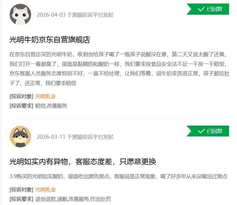 黑猫投诉平台数据显示,截至4月7日,涉及光明乳业的投诉量达568条,内容集中指向结块、变质、异味、异物等问题,其中多数投诉尚未完成处理。