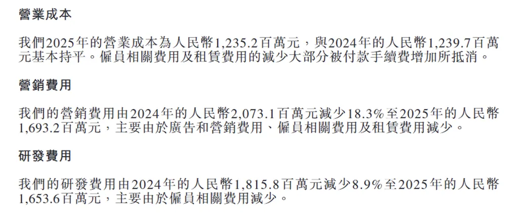 利润暴增的核心驱动力是极致的成本管控:全年销售及营销费用16.93亿元,同比下降18.3%;研发费用16.54亿元,同比下降8.9%;营业成本12.35亿元,基本与上年持平,总运营成本及费用同比下降7.1%。