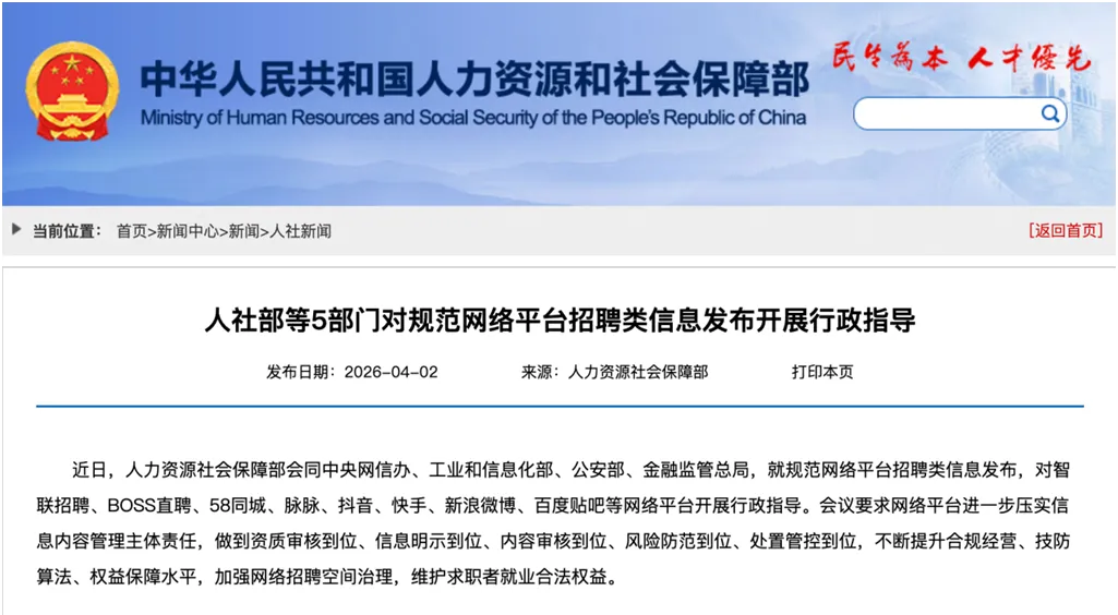 更为严峻的是,2026年4月2日,人社部、中央网信办、工信部、公安部、金融监管总局五部门联合开展行政指导,将BOSS直聘纳入重点整治对象,明确提出“五个到位”硬要求:资质审核到位、信息明示到位、内容审核到位、风险防范到位、处置管控到位,直指平台长期存在的审核不严、虚假招聘、违规收费等顽疾。此次监管并非短期约谈,而是行业规范化的标志性节点,或许在某种程度上也意味着BOSS直聘粗放式增长时代正式终结。