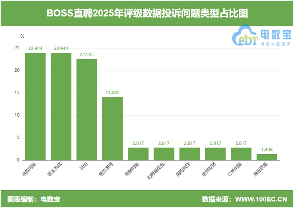与亮眼财报形成鲜明对比的,是BOSS直聘持续恶化的用户口碑与不断升级的合规压力。网经社电子商务研究中心2025年消费投诉数据显示,BOSS直聘位列数字生活领域投诉榜第6位,全年获得20次消费评级,其中9次“谨慎下单”、6次“不建议下单”,负面评级占比高达75%。