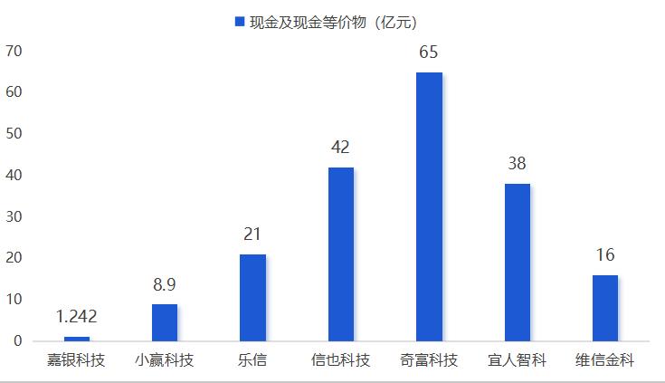 奇富科技、乐信、信也科技等头部平台的现金及现金等价物均在20亿元以上,奇富科技是嘉银科技的51倍以上。甚至放贷规模不及嘉银科技的宜人智科和维信金科的现金及现金等价物也远在嘉银科技之上。