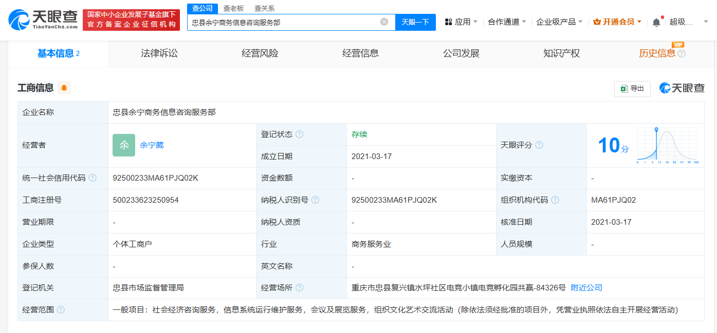 公开资料显示,小鱼名叫余宁葳。天眼查显示,余宁葳在江西蓝保科技有限公司担任监事。此外,重庆还有1家忠县余宁商务信息咨询服务部,该服务部为个体工商户,经营者为余宁葳。关联企业信息显示,潘天鸿与江西蓝保科技有限公司、忠县余宁商务信息咨询服务部无商业关联。