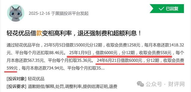 有用户反映,在轻花优品借款6000元,分12期还款,每期还款567.35元,同时借款当天被扣除558元会员费。