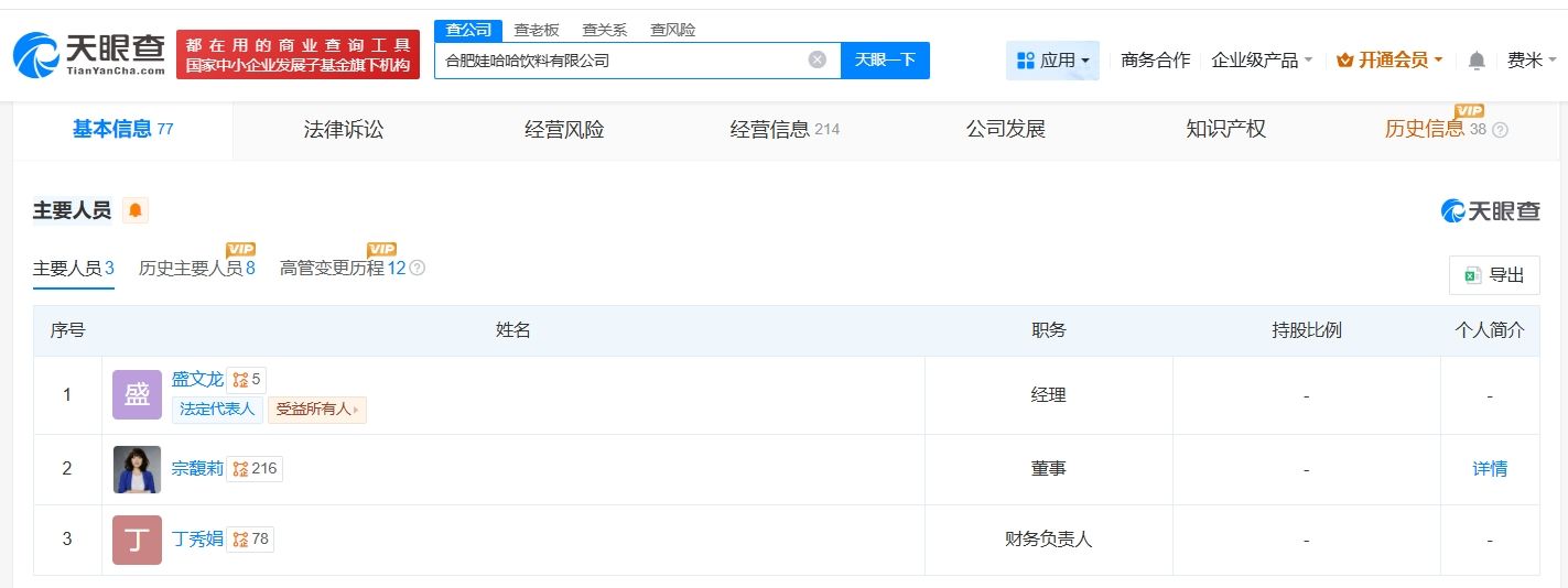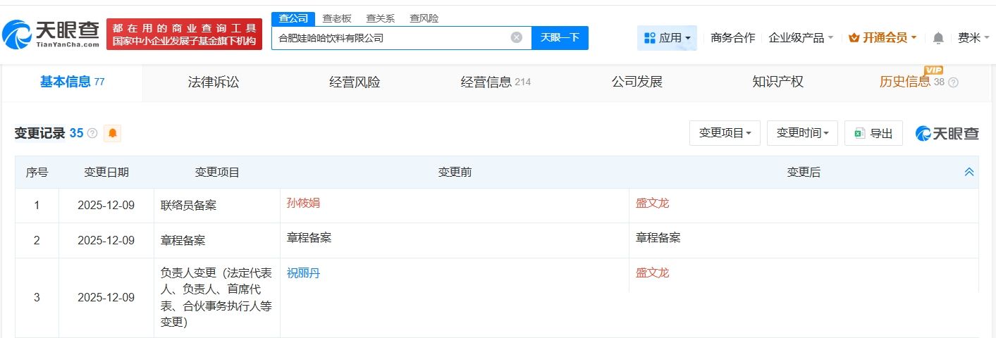 天眼查App显示,近日,合肥娃哈哈饮料有限公司发生工商变更,祝丽丹卸任法定代表人、总经理,盛文龙接任法定代表人并担任经理,同时,严学峰卸任该公司监事。