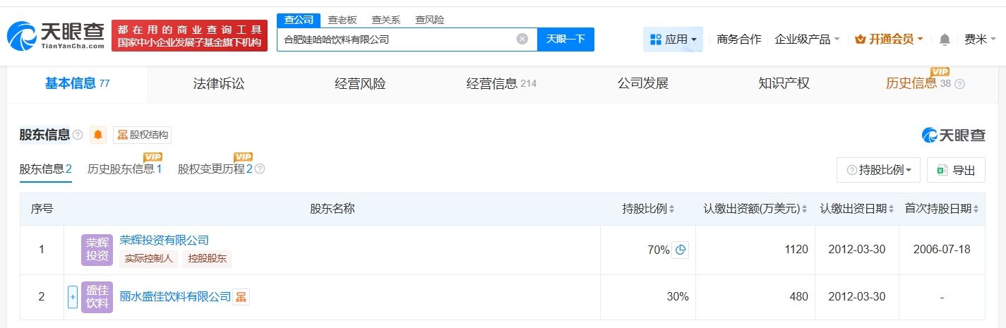该公司成立于2006年7月,注册资本1600万美元,宗馥莉为该公司董事,经营范围包括饮料生产、乳制品生产、食品生产、食品销售等,由荣辉投资有限公司、丽水盛佳饮料有限公司共同持股。