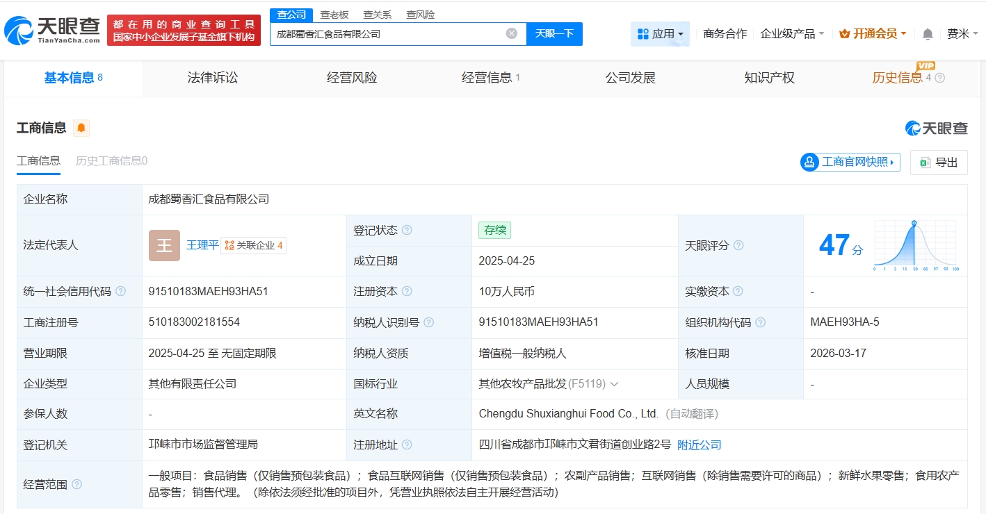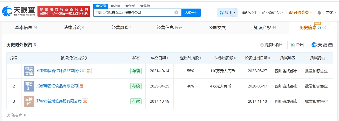 天眼查工商信息显示,3月17日,成都蜀香汇食品有限公司发生工商变更,原股东四川省蜀福香食品有限责任公司退出。