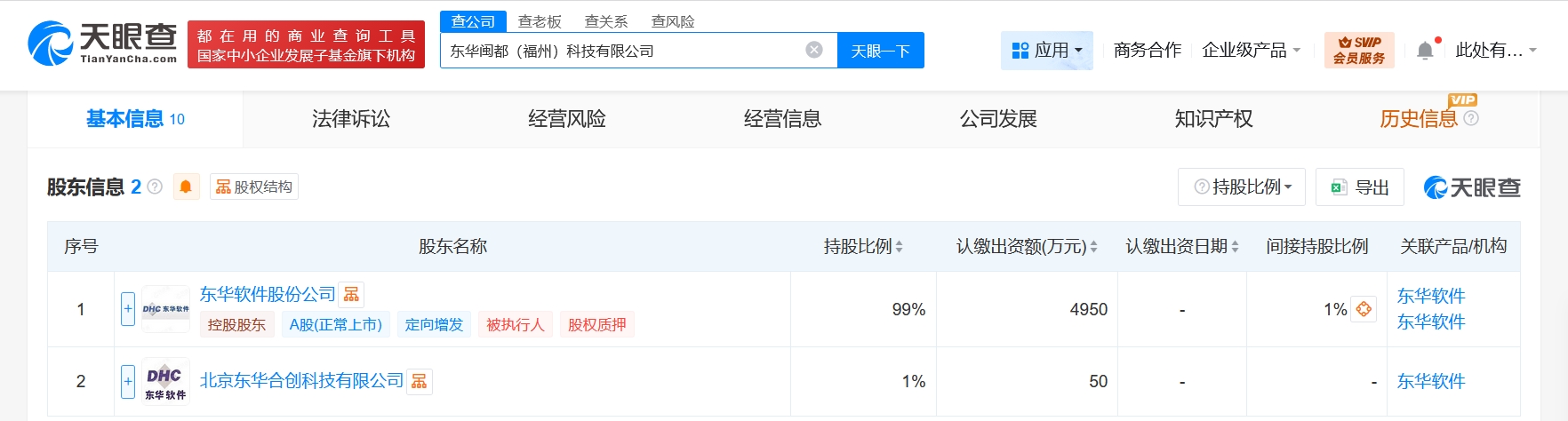 天眼查工商信息显示,近日,东华闽都(福州)科技有限公司成立,法定代表人为杨滨鲜,注册资本5000万人民币,经营范围含人工智能应用软件开发、人工智能基础软件开发、人工智能理论与算法软件开发、信息系统集成服务、数据处理服务、人工智能公共服务平台技术咨询服务、互联网安全服务等。股东信息显示,该公司由东华软件(002065)及旗下北京东华合创科技有限公司共同持股。