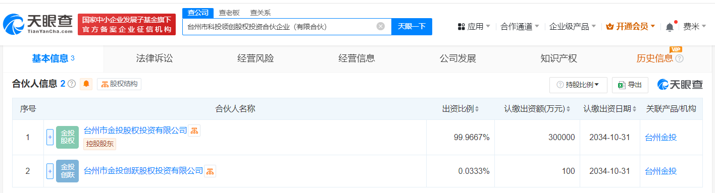 天眼查App显示,近日,台州市科投领创股权投资合伙企业(有限合伙)成立,执行事务合伙人为台州市金投创跃股权投资有限公司,出资额约30亿人民币,经营范围为股权投资、创业投资,由台州市金投股权投资有限公司、台州市金投创跃股权投资有限公司共同出资。
