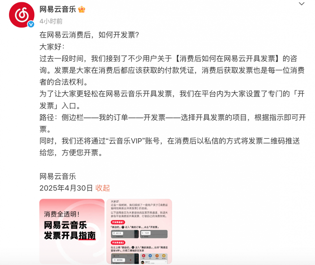 网易云音乐上线发票开具专门通道快讯