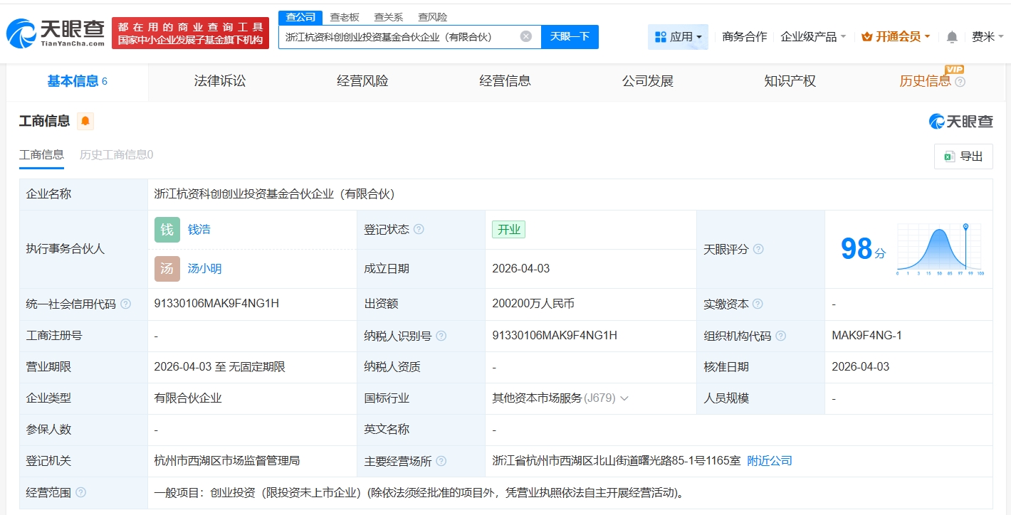 天眼查App显示,近日,浙江杭资科创创业投资基金合伙企业(有限合伙)成立,执行事务合伙人为钱浩、汤小明,出资额20.02亿人民币,经营范围为创业投资。