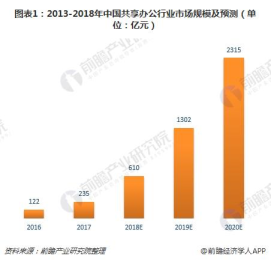 2019年2月,国家信息中心分享经济研究中心发布《中国共享经济发展年度报告(2019)》指出,我国共享经济未来三年仍将保持年均30%以上的增长速度,未来共享经济的前景必然十分广阔。而根据前瞻产业研究院预测,中国共享办公行业市场规模2019年将达到1302亿元,2020年将达到2315亿。