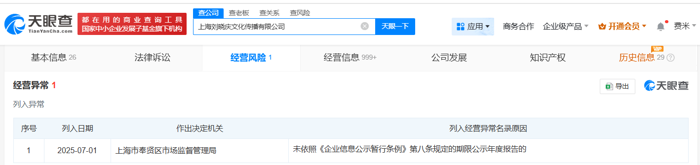 天眼查经营风险信息显示,近日,上海刘晓庆文化传播有限公司因未依照规定的期限公示年度报告,被上海市奉贤区市场监督管理局列入经营异常名录。