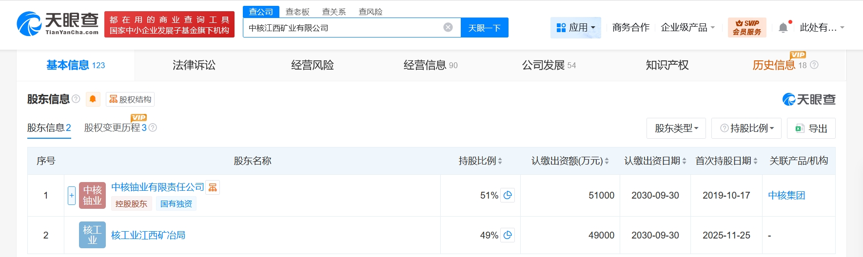 中核江西矿业有限公司成立于2019年10月,法定代表人为金伟,经营范围含矿山开发建设及退役治理、地质灾害治理施工及废物处置、环境工程的开发建设及运营、物业管理、酒店餐饮企业管理和房地产开发等。股东信息显示,该公司现由中核铀业有限责任公司、核工业江西矿冶局分别持股51%、49%。