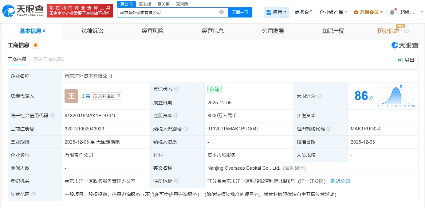 天眼查App显示,近日,南京海外资本有限公司成立,法定代表人为王雪,注册资本8000万人民币,经营范围包括股权投资、信息咨询服务。