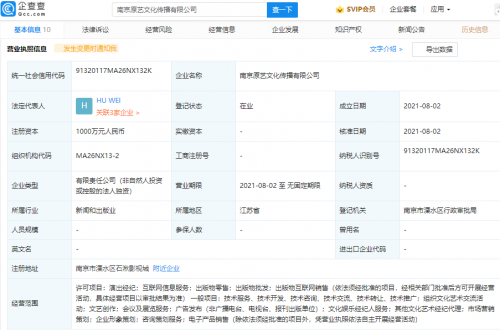 【TechWeb】企查查APP显示,8月2日,南京原艺文化传播有限公司成立,法定代表人为HU WEI,注册资本1000万元人民币,经营范围包含:演出经纪;互联网信息服务;出版物零售;出版物批发;出版物互联网销售等。