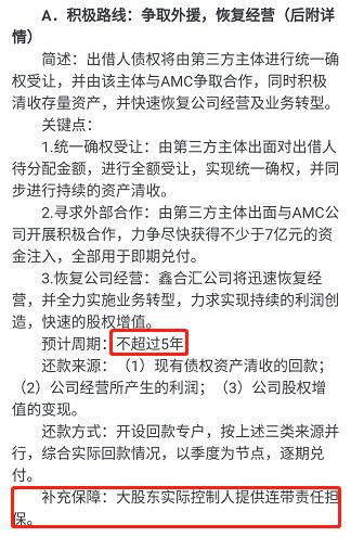 本次最新公告中的积极路线(方案A)主要是把出借人的债权打包以新公司的名义接入AMC,尽快获得7亿元的资金来解决第三期的兑付,而之后四期的兑付则在接下来的五年内逐步兑付。