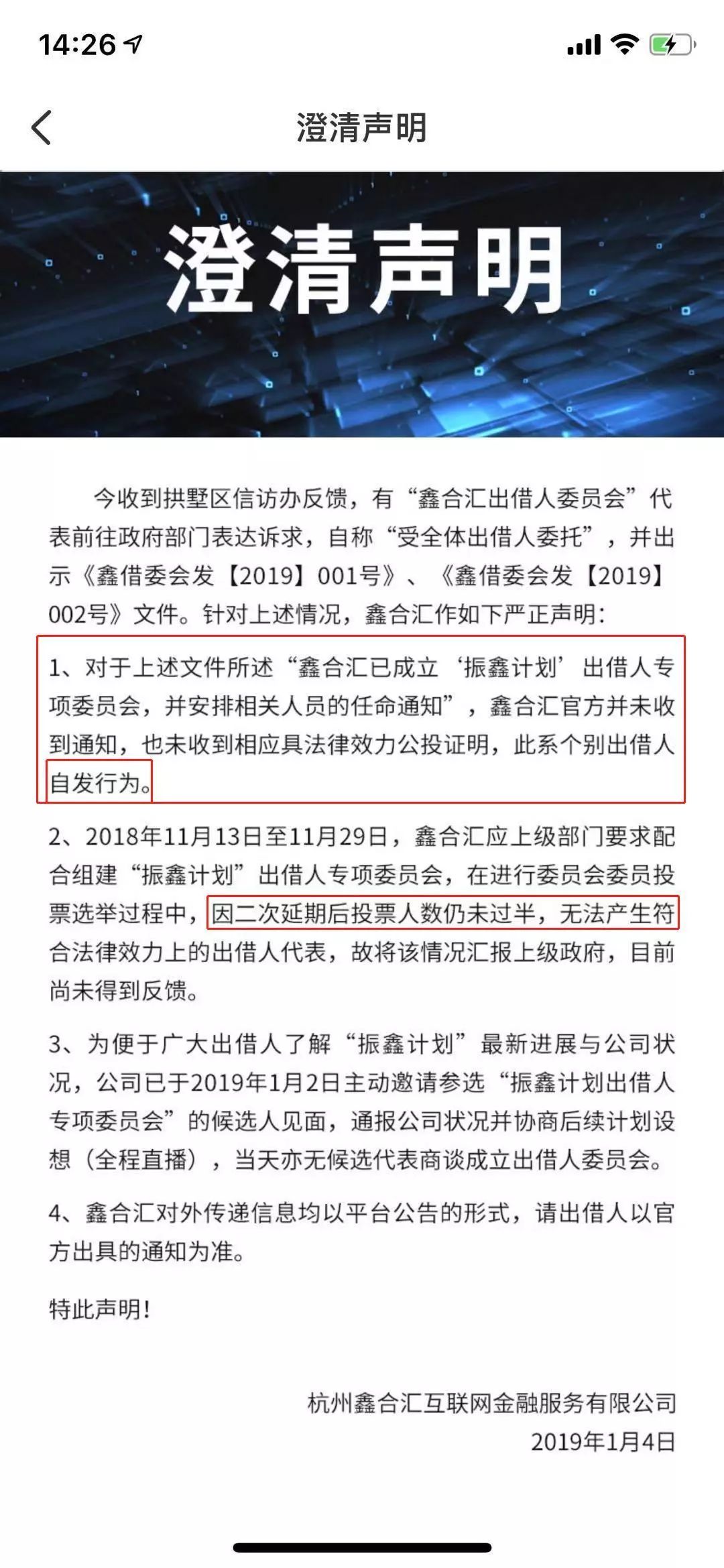 根据鑫合汇澄清声明,迟迟选不出代表竟然只是投票不过半。不禁想问,那为什么选择兑付方案这次不投票就自动归到多数票里呢?同样是投票,还能区别对待。还是说平台还没安插好出借委里自己的眼线呢?