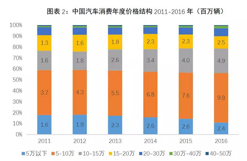 根据《2016中国汽车品牌消费报告》显示,中国汽车消费价格结构中,20万以下的车型一直占到绝对的优势。考虑到近两年国民消费水平的提升,30万以上的汽车销量占比仍不会超过百分之十。按照蔚来主打的30-50万区间的ES6/ES8的表现已经很亮眼。