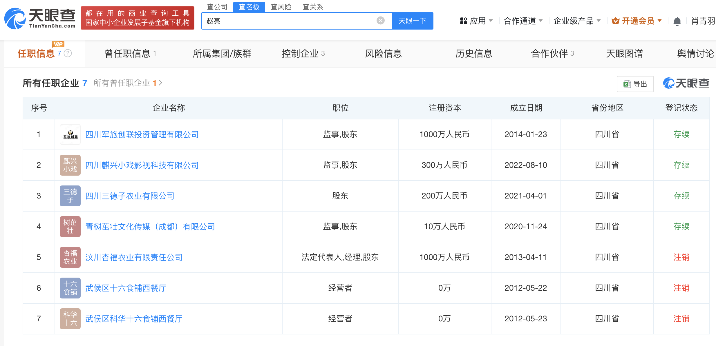 商业履历信息显示,赵亮名下关联7家企业,包括青树茁壮文化传媒(成都)有限公司、四川麒兴小戏影视科技有限公司、四川三德子农业有限公司等,涉及文化传媒、影视、农业等领域,赵亮在上述企业中担任监事、股东等。