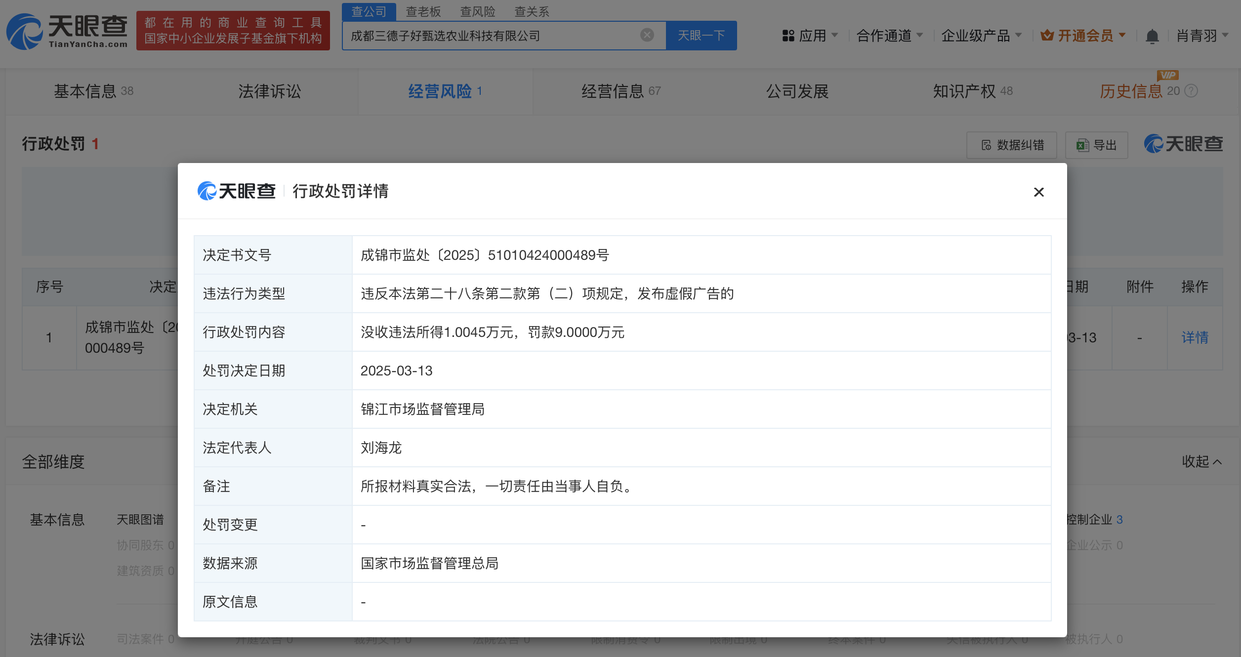 天眼查App显示,成都三德子好甄选农业科技有限公司成立于2023年7月,法定代表人为刘海龙,注册资本100万人民币,经营范围包括食用农产品零售、智能农业管理、供应链管理服务、食品互联网销售等,由成都中创慧兴传媒科技有限公司、成都壹盏灯文化交流中心共同持股。行政处罚信息显示,今年3月,该公司因发布虚假广告,被锦江市场监督管理局罚没超10万元。