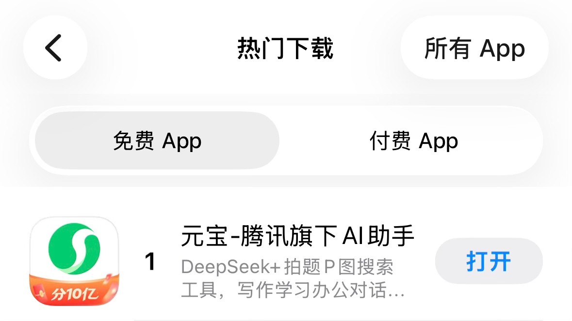 从用户行为层面看,元宝这次派发10亿元红包的活动并不缺少参与热情。相信大家在这几天时间里,不论是各大微信群,或者是朋友圈里,都能看到元宝的红包活动链接。这种大规模的“刷屏”,对于元宝的知名度确实有不少的提升。从元宝登顶App Store免费榜第一,这一现象级热度证明了“红包策略”的传播效果确实有效。