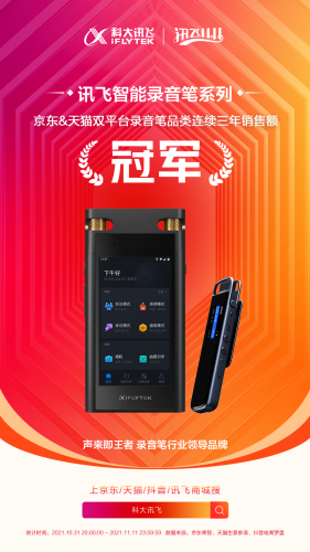 双11期间,讯飞智能录音笔系列产品连续第三年获得了京东&天猫双平台录音笔品类销售额冠军。