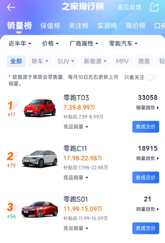 零跑在今年上半年不仅获得了一次月销冠军,还在3月份赴港交所递交招股书,在5月份发布18-27万纯电轿车零跑C01,进入中高端市场与第一梯队小鹏、蔚来掰手腕。